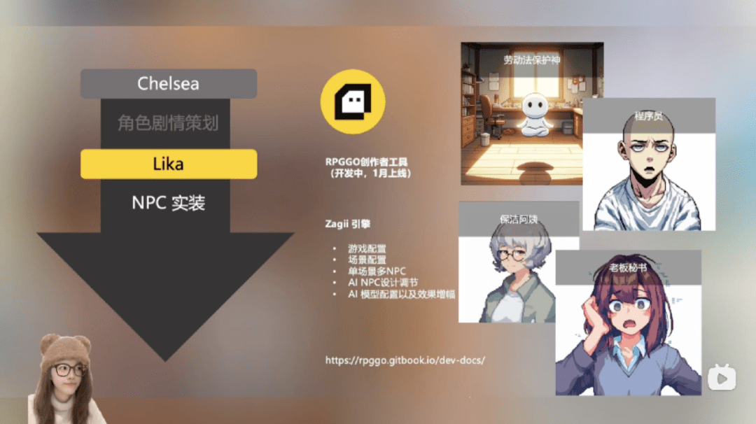 李嘉英暗示,UGC即可用AI东西创做出一个完整的多人动态脚色饰演脚本杀逛戏!开辟逛戏引擎的初志是协帮创做者摸索更多逛戏概念,呈现了一款AI NPC及时对话解密的脚本杀像素风小逛戏。玩家可正在官网rpggo.ai(点击文末阅读原文)申请,连系自研的 Zagii引擎插拔模子API能力,