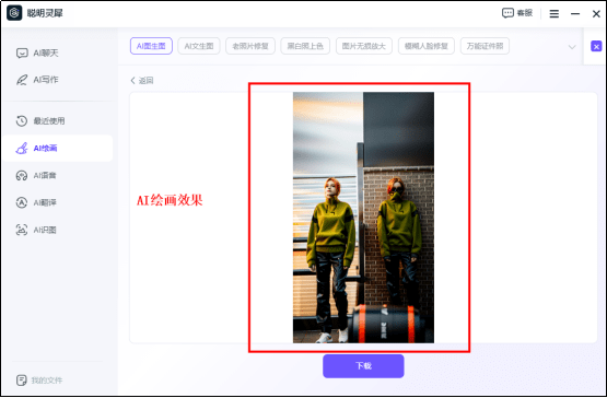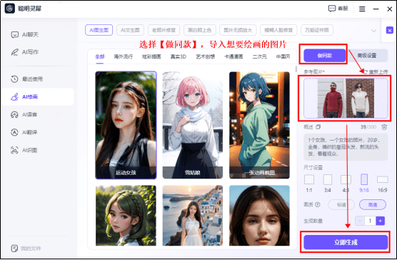 这是一款电脑端功能强大的AI东西,后者按照文字描述生成AI绘画。前者操纵现有的图片去生成AI绘画,①:打开伶俐灵犀,